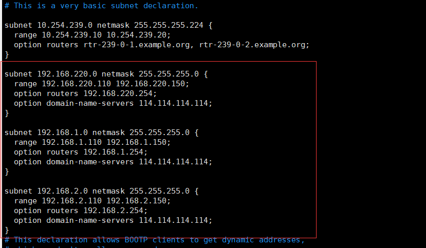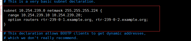 subnet 192.168.0.0 netmask 255.255.255.0 { ###网段声明