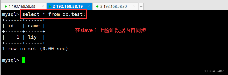 查看 master的 VIP 地址 192.168.58.100 是否存在,这个 VIP 地址不会因为 manager 节点停止 MHA 服务而消失。