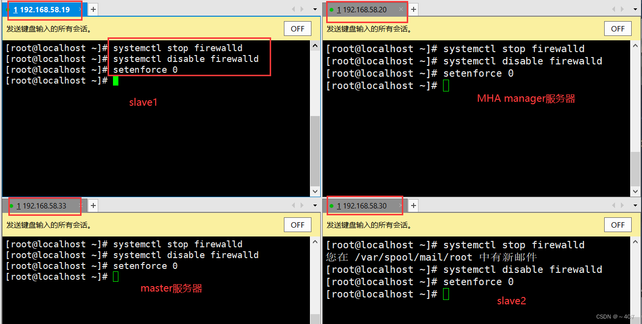 | Slave2节点服务器 | CentOS7.4(64 位) | 192.168.58.30 | 安装mysql5.7和MHA node组件 |