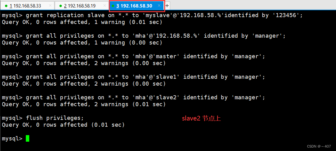 grant all privileges on *.* to 'mha'@'192.168.10.%' identified by 'manager'; #manager 使用