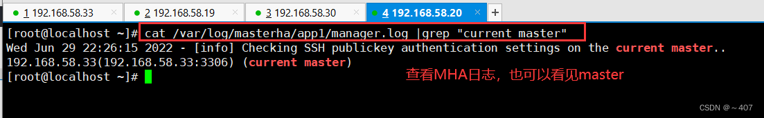 查看 MHA 日志,也以看到当前的 master 是 192.168.58.33,如下所示。