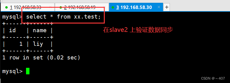 #在slave1,slave2上查看,正常自动切换一次后,MHA 进程会退出。HMA 会自动修改 app1.cnf 文件内容,将宕机的 mysql1 节点删除。查看 mysql2 是否接管 VIP