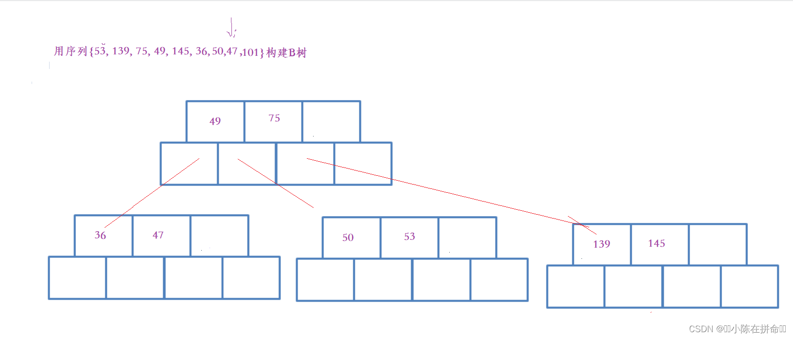 用序列{53, 139, 75, 49, 145, 36, 50,47,101}构建B+树的过程如下:
