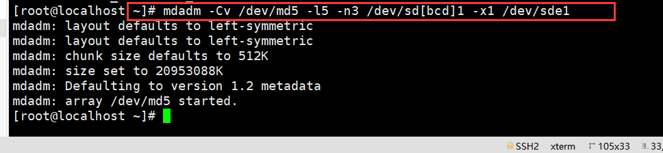 创建RAID5 指定使用/dev/sde1硬盘做RAID的热备用盘,x1表示保留1块空闲的硬盘作备用