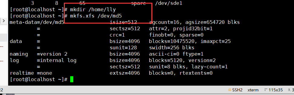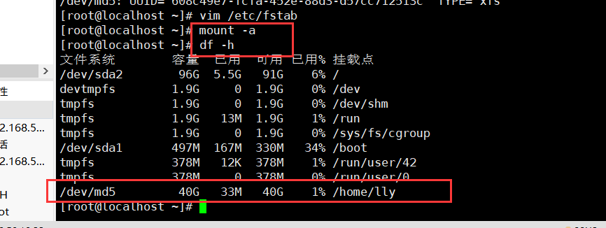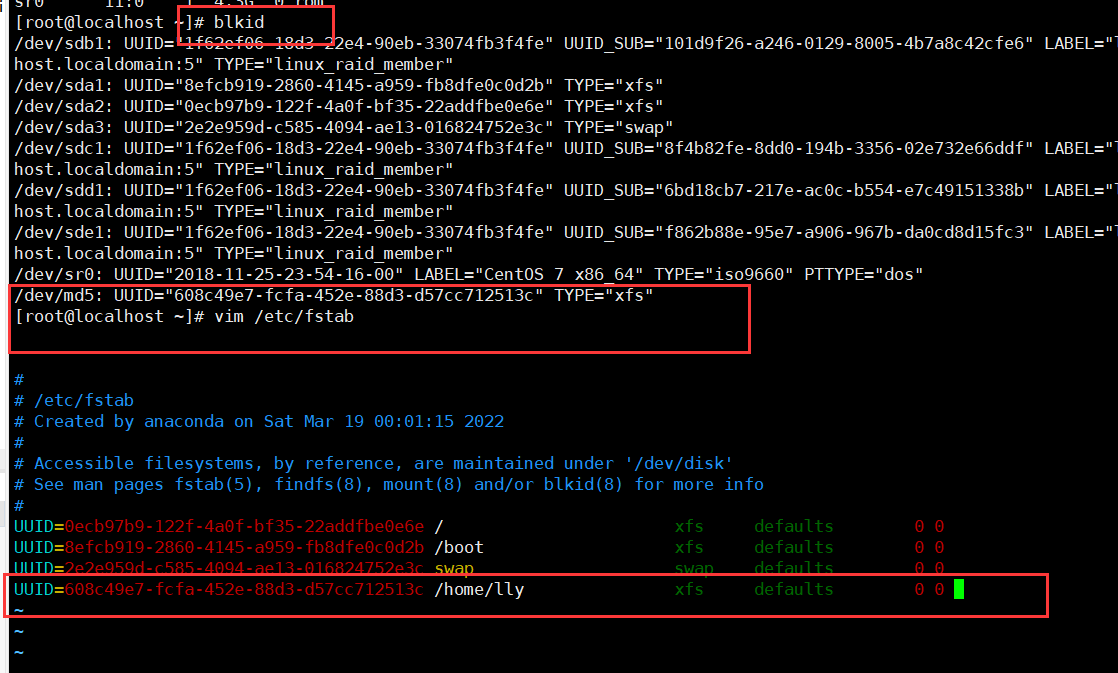 查看md5的uuid 进行永久挂载到/home/lly 临时挂载:mount /dev/md5 /home/lly
