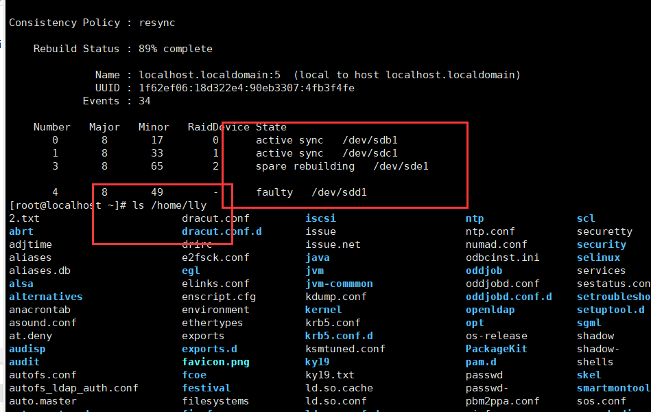 此时我们查看/home/lly时数据还是在的,说明sde1已经顶替sdd1了