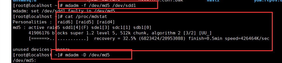 mdadm /dev/md0 -f /dev/sdb1 #模拟/dev/sdb1 故障
